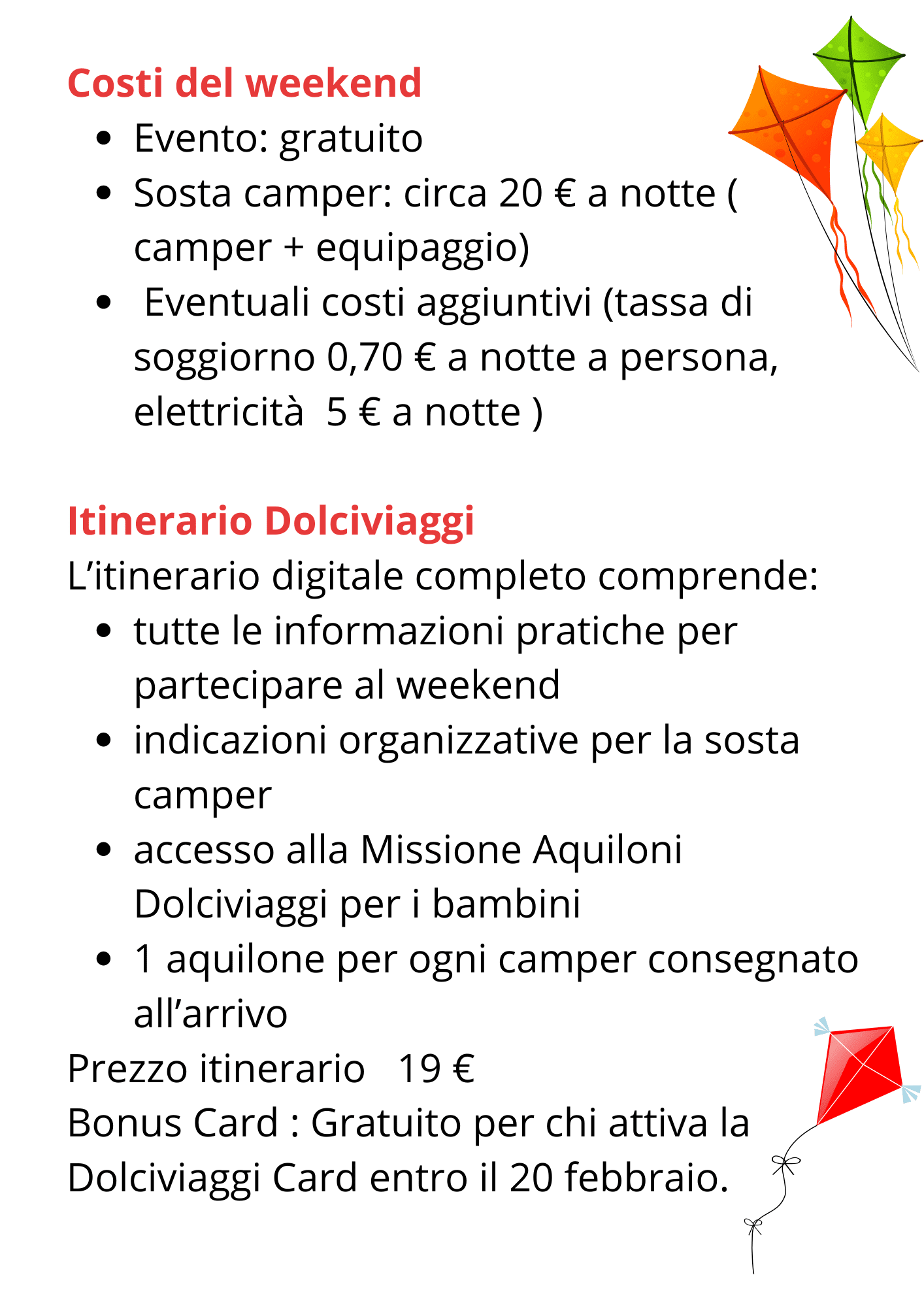 Per garantire un’esperienza piacevole verranno preparati solo un numero limitato di kit aquilone, uno per ogni camper partecipante. Al raggiungimento del limite l’esperienza verrà chiusa.